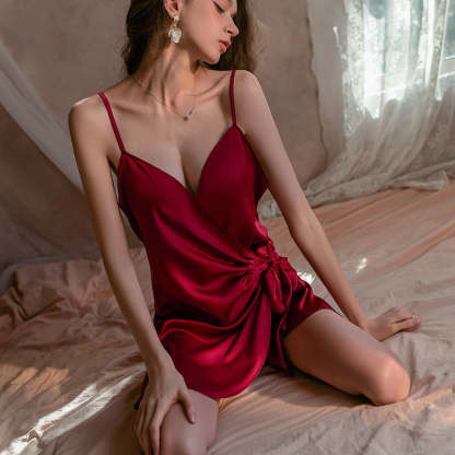 Experience the ultimate in comfort and luxury with our Sexy Pure Ice Silk Satin Deep V Suspender Nightdress Pajamas-D8908. Crafted with exquisite attention to detail, these pajamas redefine sensual elegance. The deep V design and seductive satin fabric exude a timeless allure. Indulge in relaxation and awaken your inner confidence with our irresistibly sultry nightdress pajamas.